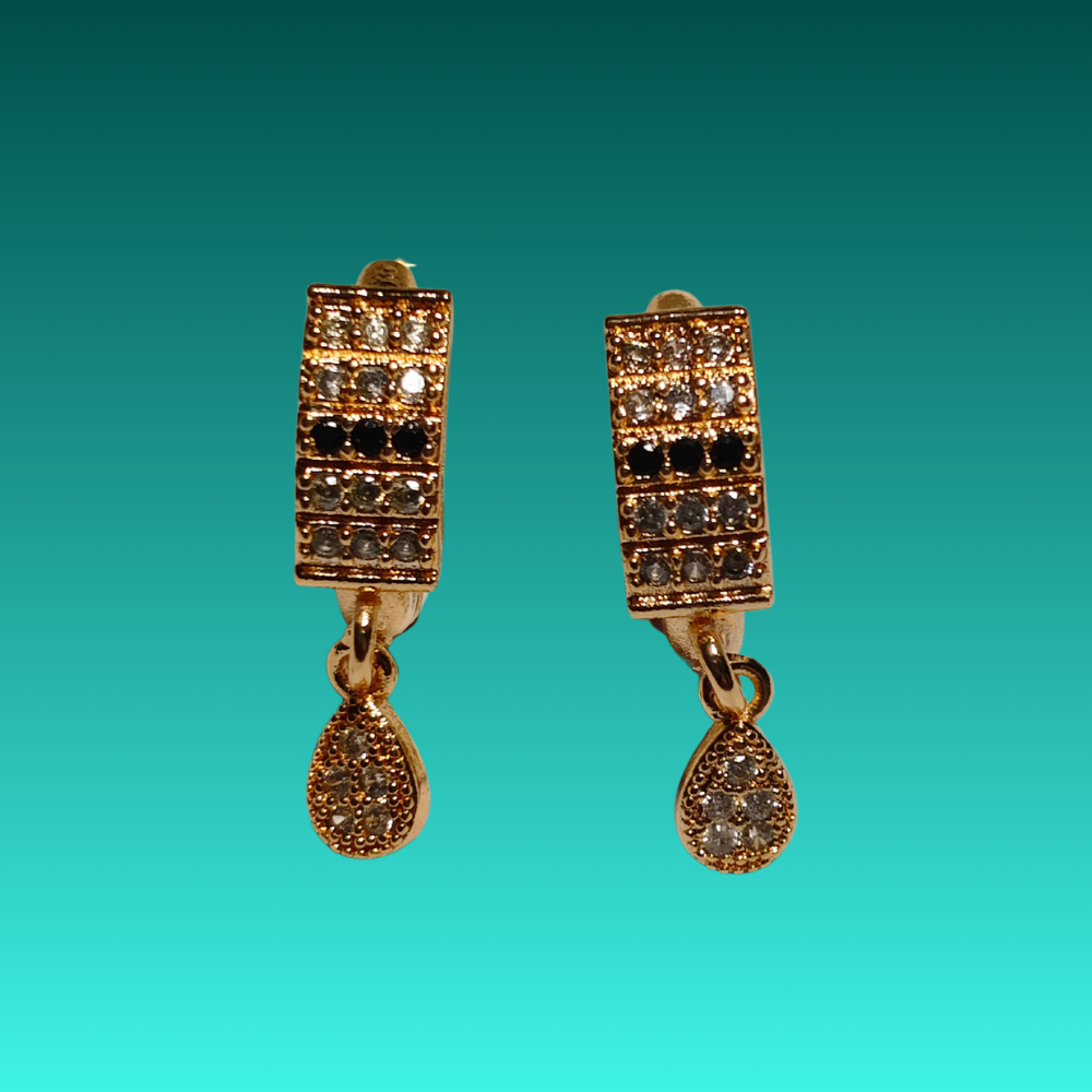A modern take on classic sparkle. These dazzling gold-tone earrings feature a striking rectangular bar top, meticulously set with rows of brilliant cubic zirconia (CZ) crystals. The design incorporates a sophisticated pattern of shimmering white CZ stripes separated by a contrasting band of sleek black CZ stones, giving them a rich, textural depth. A graceful micro-pave encrusted teardrop dangles below, adding beautiful movement and maximum light reflection. These secure clip-back earrings are perfect for adding a touch of bold glamour to a business outfit or making a statement on a night out. They’re chic, structured, and anything but not boring.