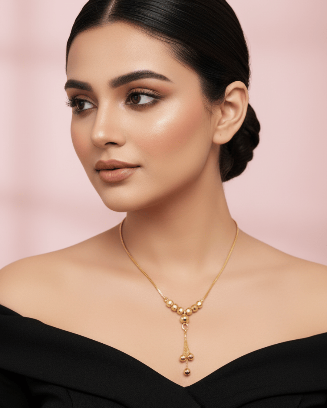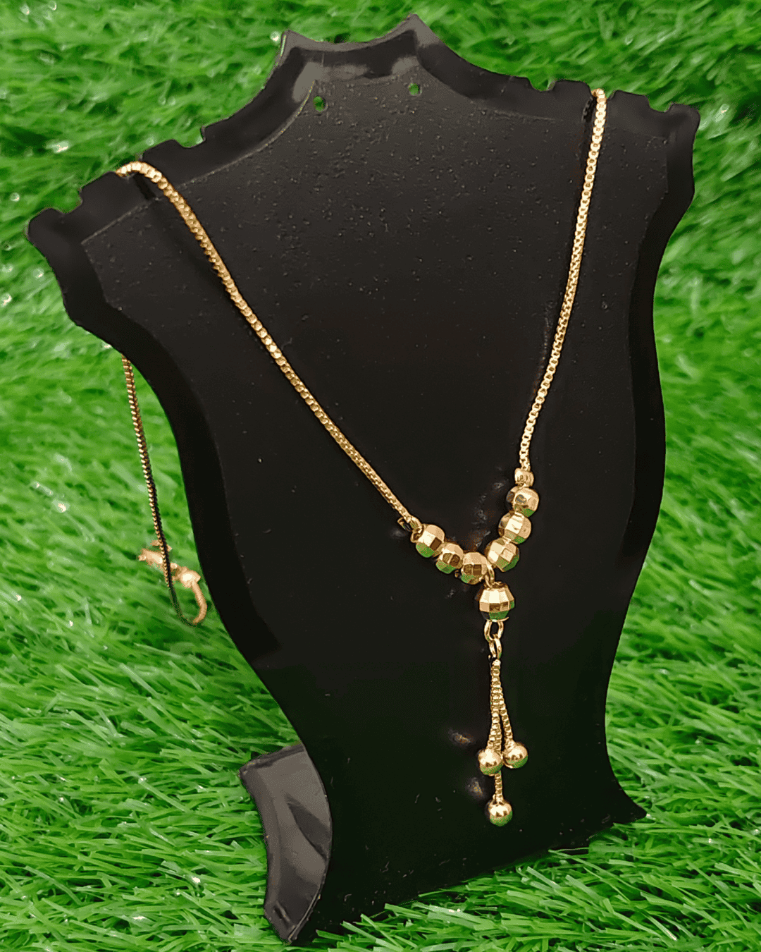 • Design & Structure: This is a streamlined Lariat or Y-style necklace. It features a finely woven, high-quality box chain that adds texture and strength. The chain gracefully dips to a pendant section anchored by stylish, faceted gold-toned beads.