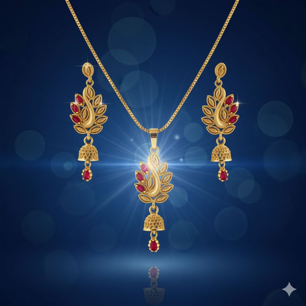 - The Necklace: Features a fine chain supporting a pendant that mirrors the main leaf design. A signature, intricately textured Jhumka (bell) and a teardrop red stone dangle from the bottom, creating subtle, captivating movement.