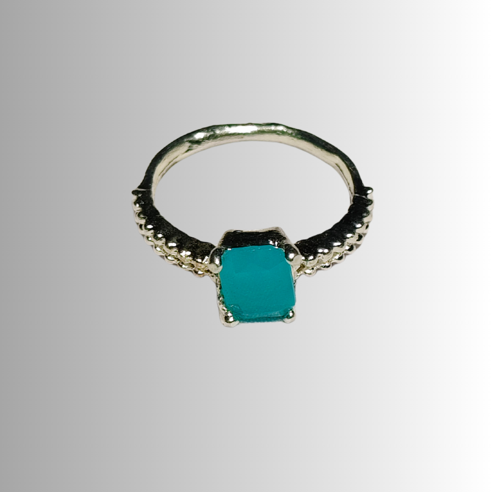 - Vivid Center Stone: The centerpiece is a prominent rectangular/emerald-cut gemstone in a striking, opaque turquoise color. This bold hue adds a pop of coastal elegance and is reminiscent of fine, natural turquoise jewelry.